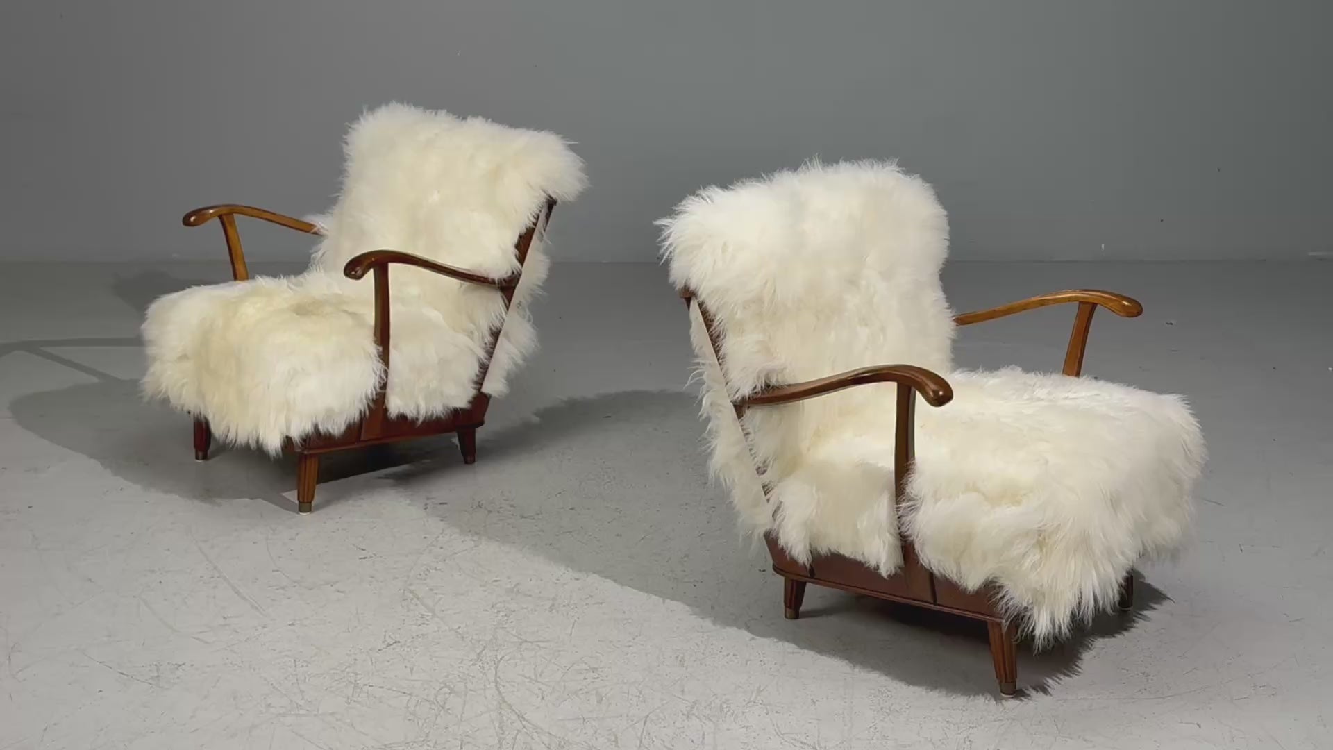Swedish Modern, Organic Lounge Chairs, Shearling, Wood, Sweden, 1940s