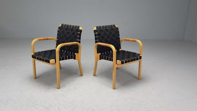 Alvar Aalto, Birch, Rattan, Black Linen Webbing, Armchairs, Finland, 1980s