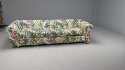 A large custom made sofa dressed in a tropical printed fabric. Having three removable seat cushions.