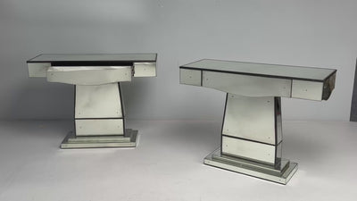 Pair of modernist console tables featuring solid wood construction clad with 30+ individual antique glass pieces. Each example features exposed screw heads, a singular pull out drawer, and dual level stepped pedestal bases .