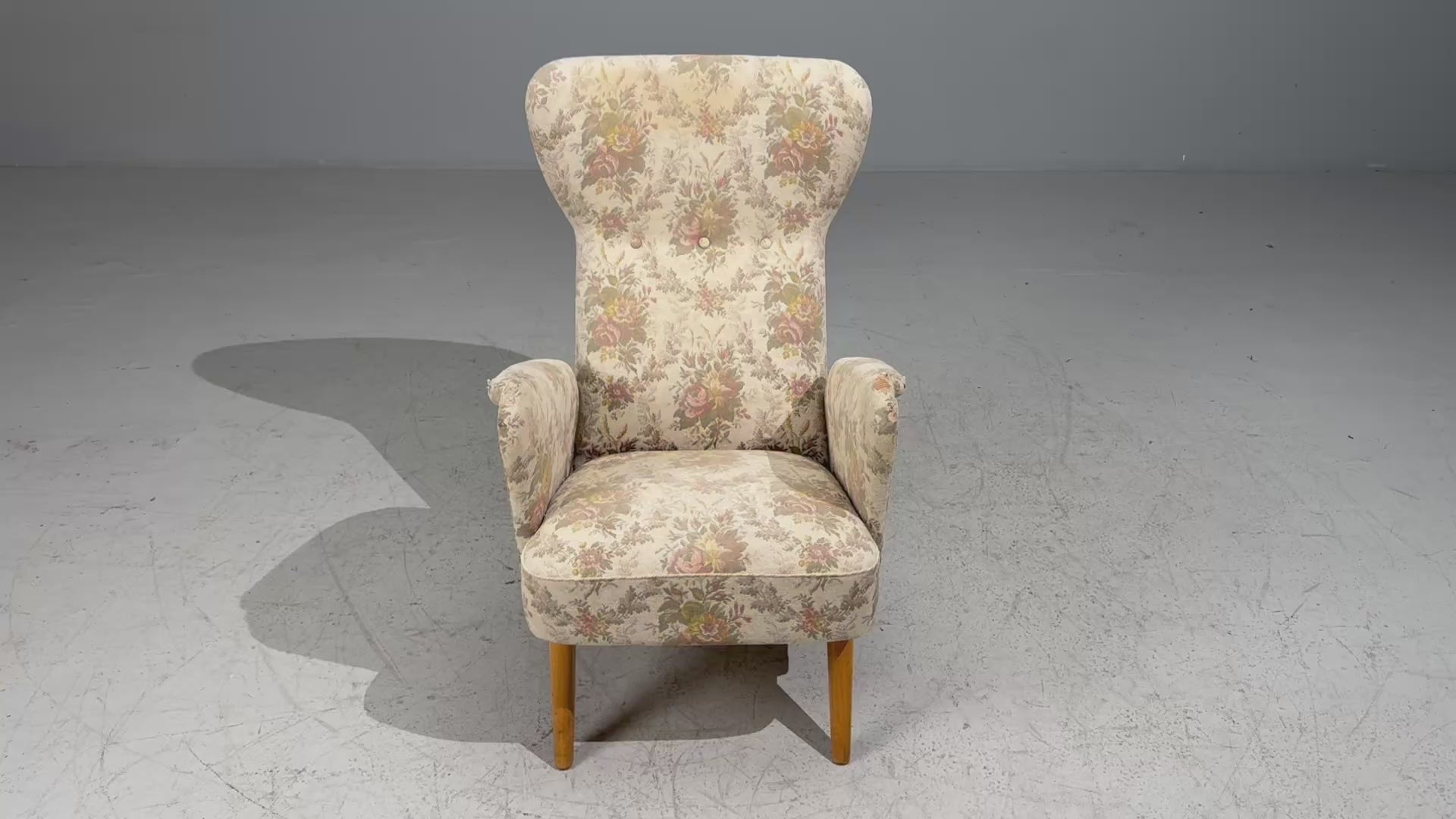 A single floral fabric and lacquered wood armchair designed by Carl Gustaf Hiort af Ornäs (Finland, 1911-1995) for Hiort Tuote Puunveisto in Finland c. 1940s.