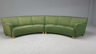 Danish Cabinetmaker, Mid-Century Modern, Green Fabric, Wood, Two Piece Banana Sofa, Denmark, 1960s