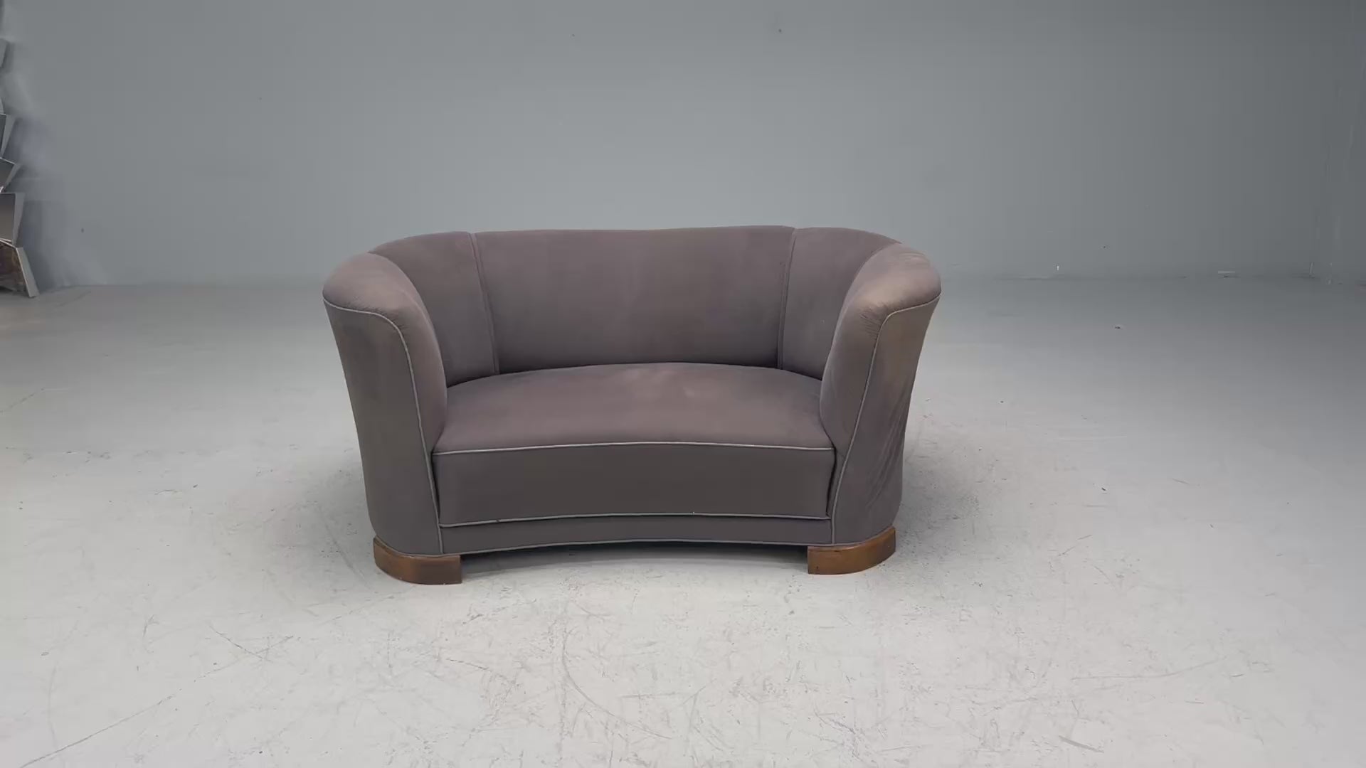 A substantial curved two seater sofa or settee produced by an unknown cabinetmaker in Denmark in the early part of the 20th century. Vintage fabric in fair condition - reupholstery before use is recommended.