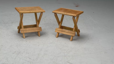 Pair of diminutive side or end tables designed and produced in Demark c. 1970s. Each example features tightly woven cane tops and collapsible compass form oak frames.
