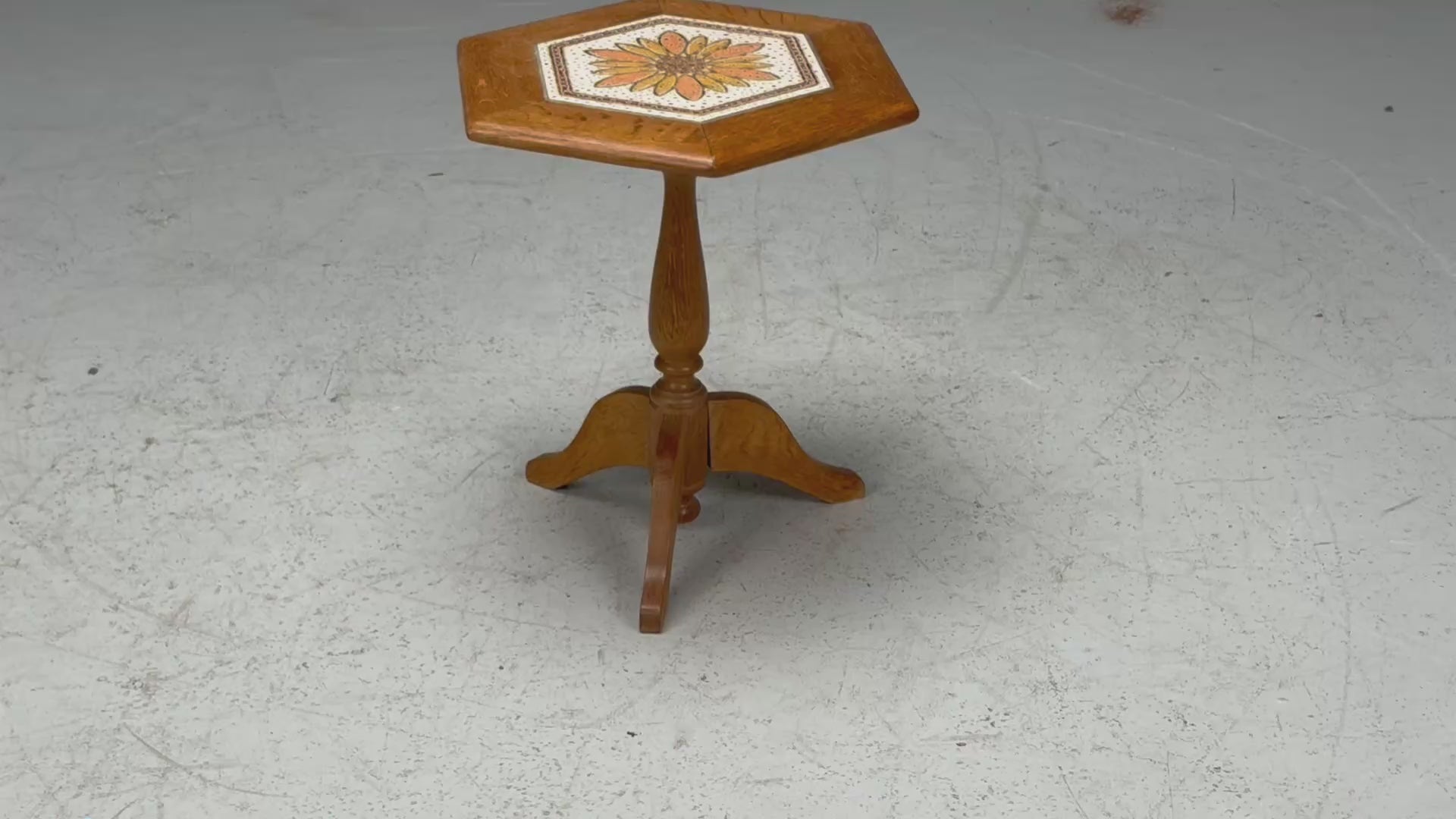 A modernist end table designed and produced in Denmark in the 1970s. This example features a tripod base and hexagonal top with an inset ceramic floral design. Marked "17 OKT 1975" on the underside of the table top.