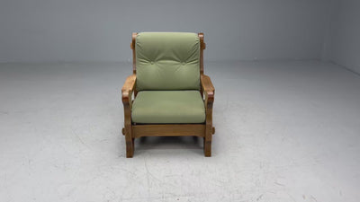 A substantial brutalist style lounge chair designed and produced in Denmark in the later half of the 20th century. This example features a heavy carved oak frame with quality mortise and tenon joints and removable green nubuck seat and back cushions.