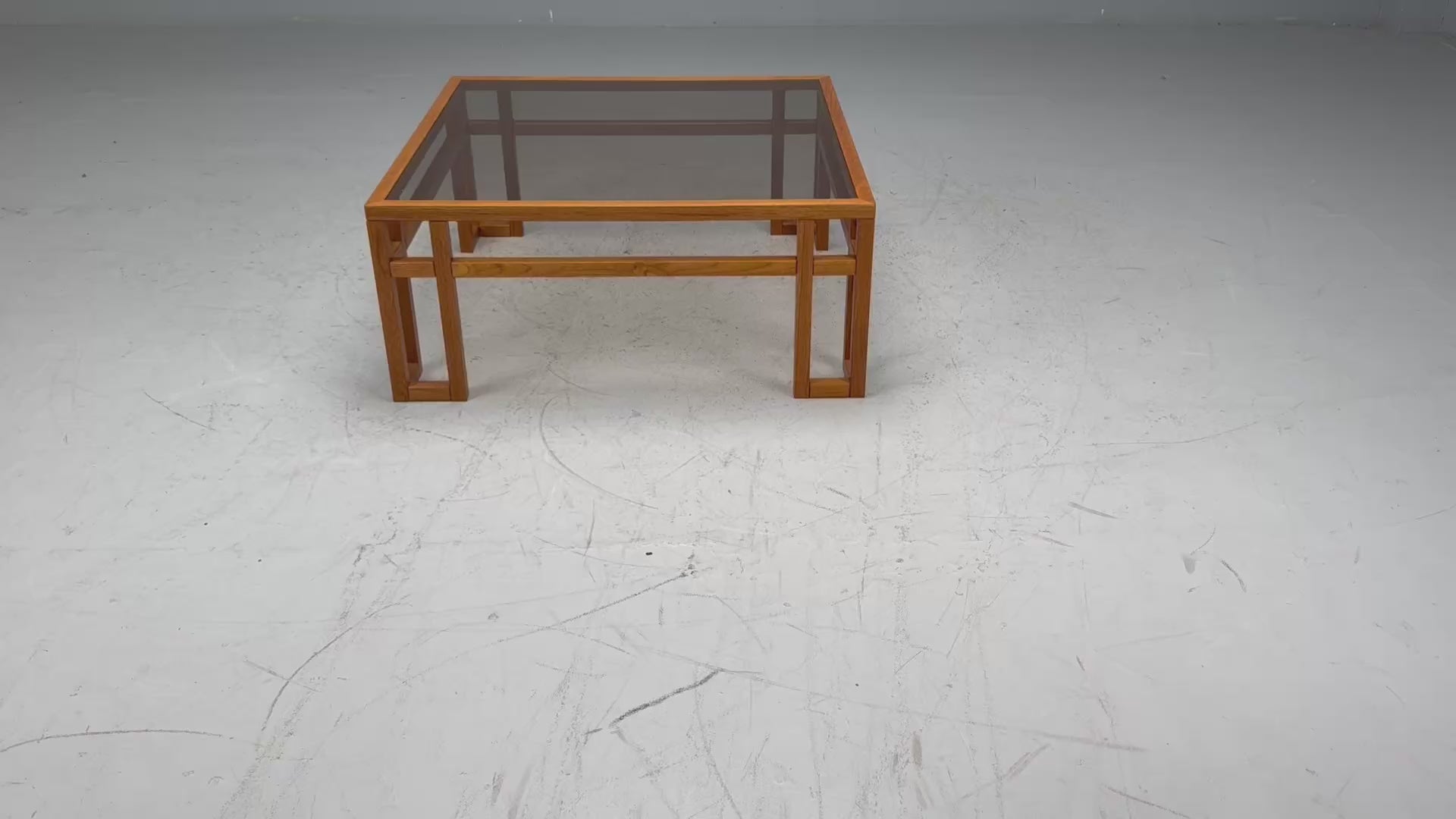 A geometric teak and smokey glass square coffee table designed and produced in Denmark c. 1960s. This example maintains it's original "MADE IN DENMARK" label on the underside of one stretcher.