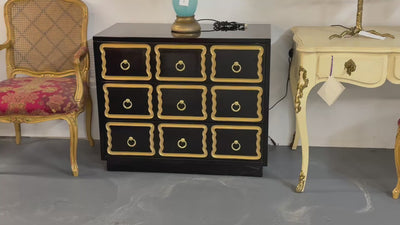 Dorothy Draper Style, Hollywood Regency, Black Lacquer, Gilt, Brass, Commodes