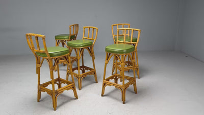 Dutch Mid-Century Modern, Bamboo, Green Leather, Five Barstools, Netherlands, 1970s