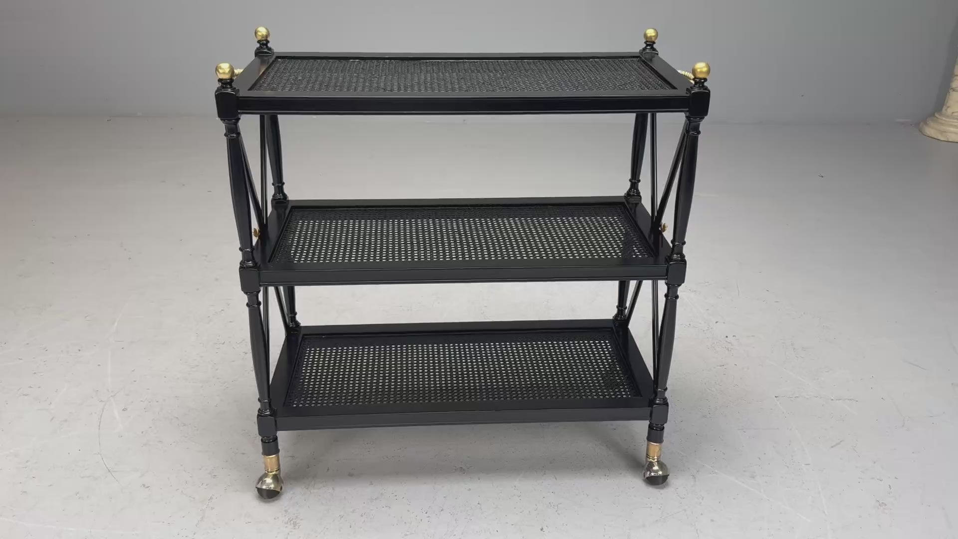 Hollywood Regency Style, Painted Wood, Cane, Ebonized Three-Tier Bar Cart, USA, 1970s