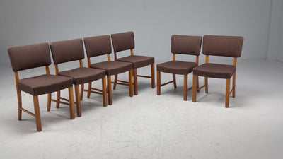 A set of six brown wool and oak dining chairs designed and produced by Fritz Hansen in the Denmark in the first half of the 20th century. Our gallery can assist with re-upholstery. Two chairs present slightly shorter than the other four.