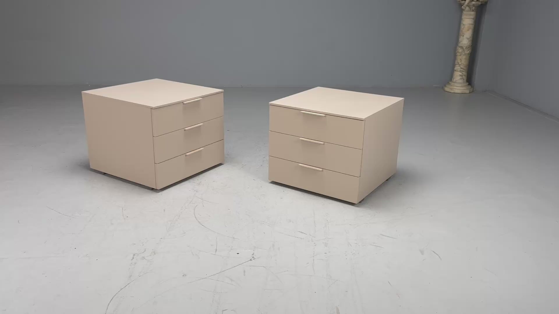 A modernist "Brest Notte" model pair of end tables or nightstands designed by Guilio Cappelini for Cappellini in 2009 and retailed by Poltrona Frau. This example is finished in a neutral cream matte color lacquer. Matching pair of high chest available separately. Designed by Giulio Cappellini, the Brest series consists of chest of drawers and nightstands having a one year wait each are finished with matte or glossy lacquer in all the colors of the collection.