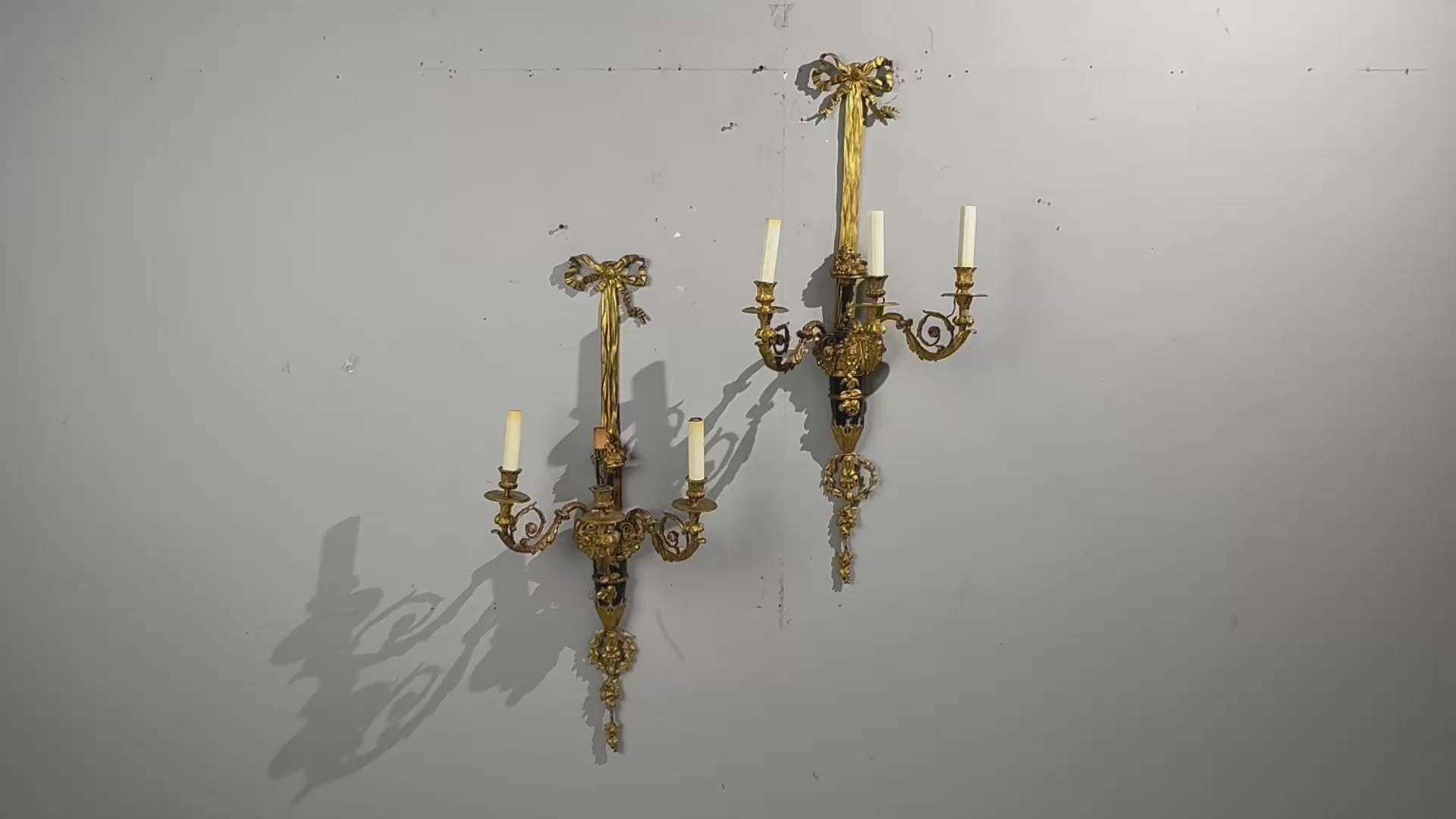 A large and impressive pair of Louis XVI–style wall sconces executed in gilt and ebony-patinated dore bronze. Each sconce is modeled in the form of a tapered classical amphora, issuing three bronze arms with twisted fluting and decorative elements cast as acanthus leaves and clusters of fruit. The stems are richly ornamented with figural mask motifs, including a female mask and a pair of horned satyr masks, accented with aigrettes and garlands of fruit that descend into a graceful cascade of foliage. This is a simply stunning pair of very fine quality bronze wall sconces.