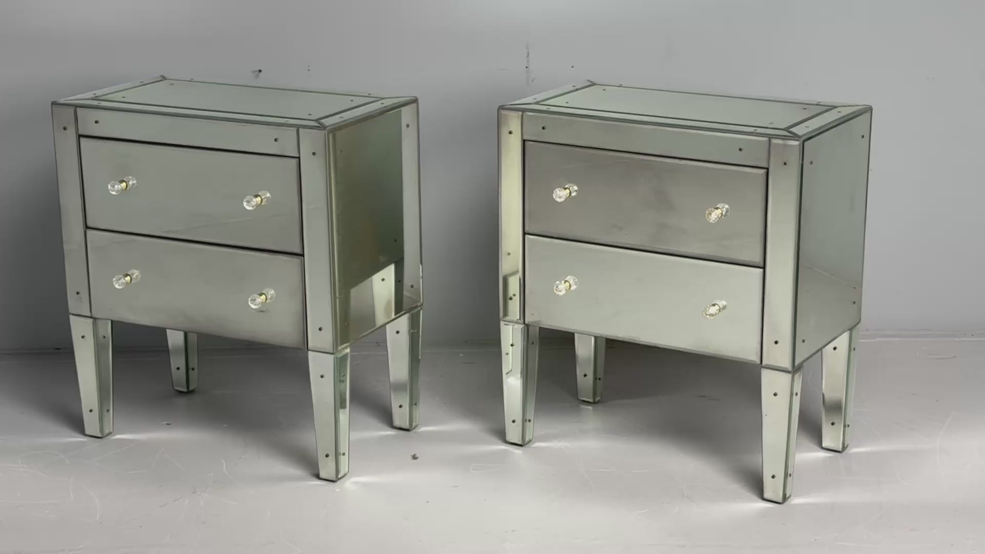 Pair of Hollywood Regency style nightstands featuring solid wood construction clad with approximately 25+ individual antique mirror pieces. Each example having exposed screw heads and two pull out drawers with lucite and brass drawer pulls.