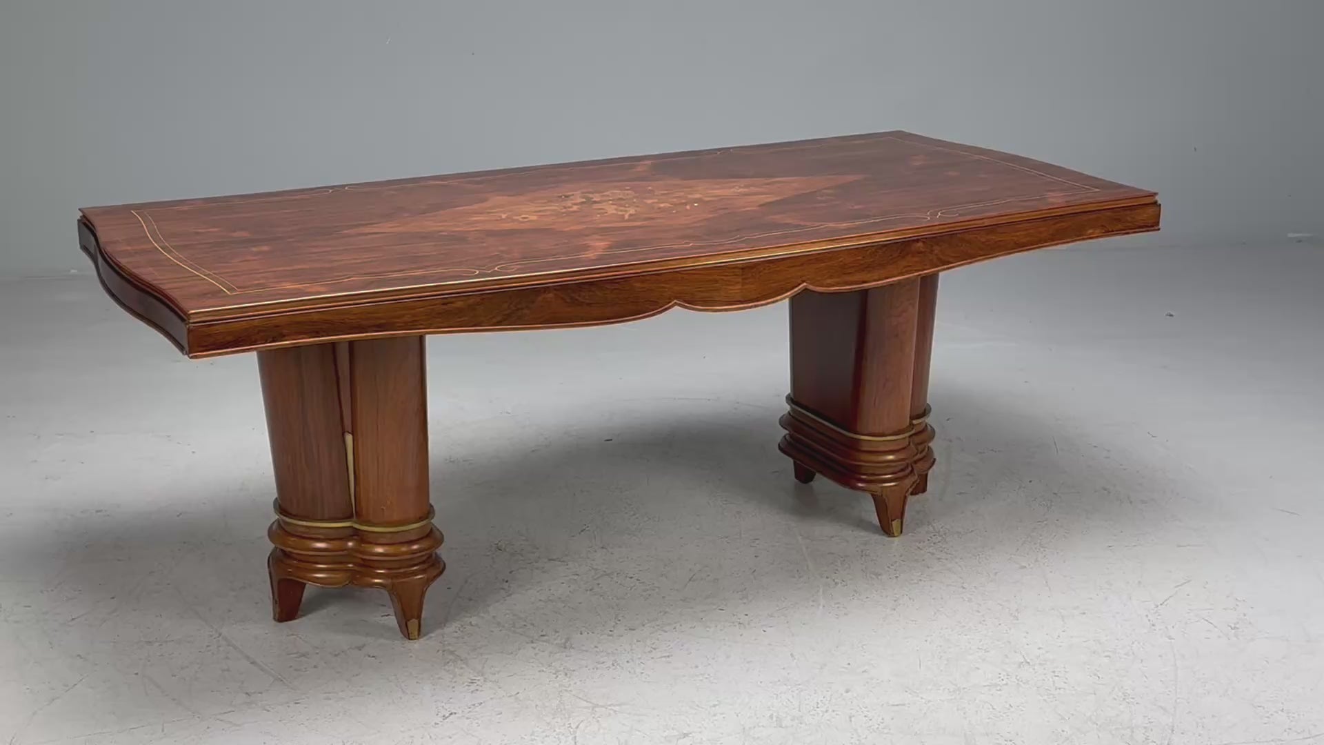 A rare Art Deco dining table designed in France circa 1935 by Jules Leleu (1883-1961). The table features a fruitwood marquetry and abalone-inlaid rosewood top, which has been fully refinished, and rests on a bronze-mounted double pedestal base. It is expandable, with extensions on both sides for custom-made insertable leaves (leaves not included).