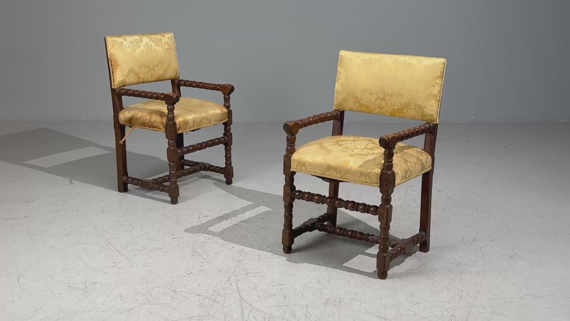 Pair of baroque armchairs designed and produced in the Netherlands in the mid to later half of the 17th century. Each example features cherry bobbin arms, vintage silk fabric, and carved legs having an H- form stretcher.