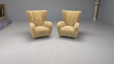 Pair of large organic form lounge chairs attributed to Meroni & Fossati and produced in Italy in the middle of the 20th century. Each example has been newly upholstered in a luxurious genuine honey shearling and maintains it's four slightly tilted stained wood legs.