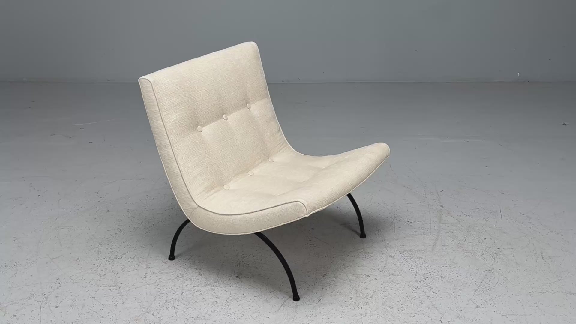 A lacquered iron and beige fabric "Scoop" lounge chair designed by Milo Baughman for Thayer Coggin in the United States c. 1950s. This example has been newly re-upholstered in a neutral beige color textured linen.