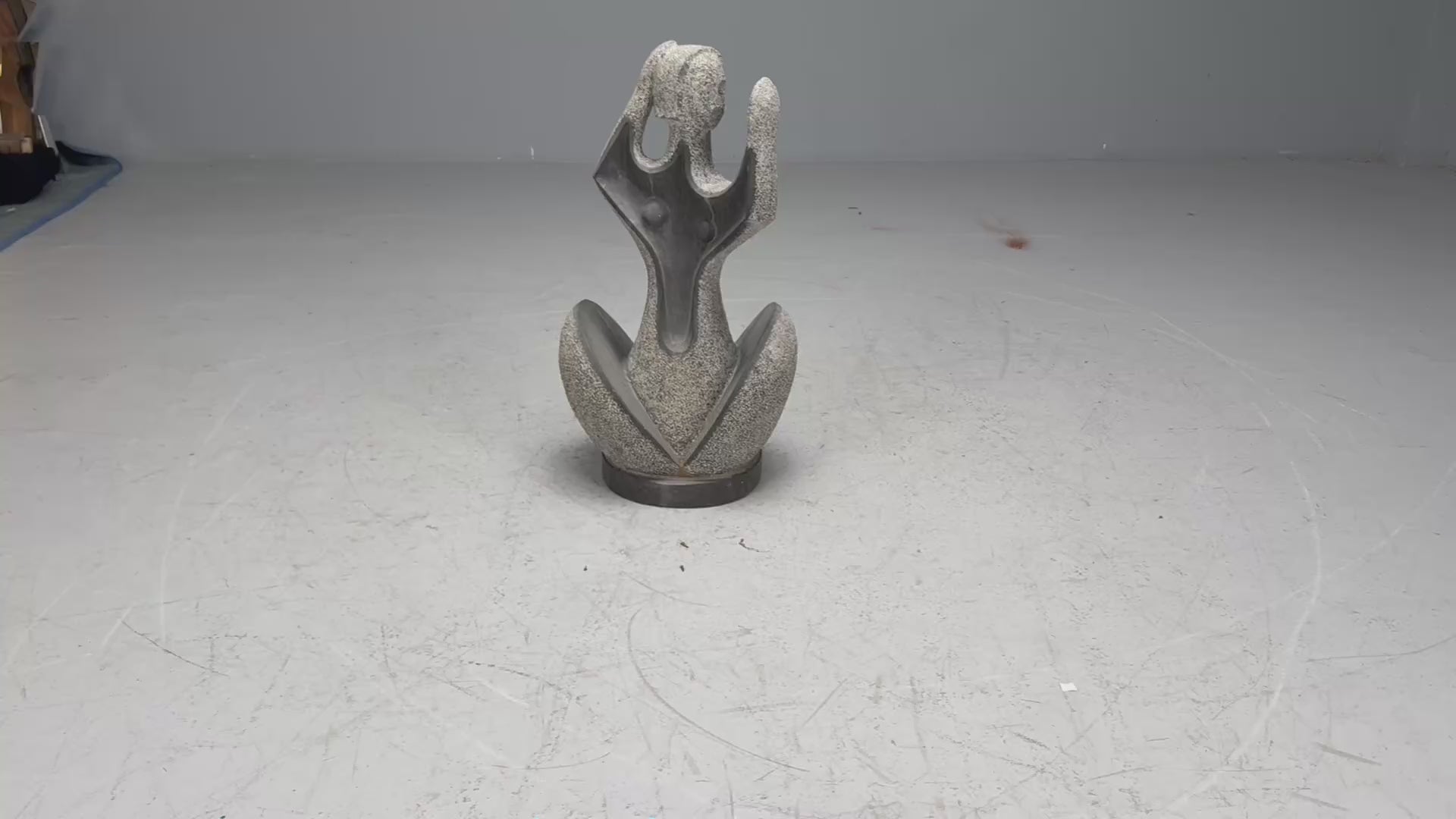 A modernist grey and black carved stone figure by an unknown maker in the middle of the 20th century. Featuring a nude woman sitting with her hands up.