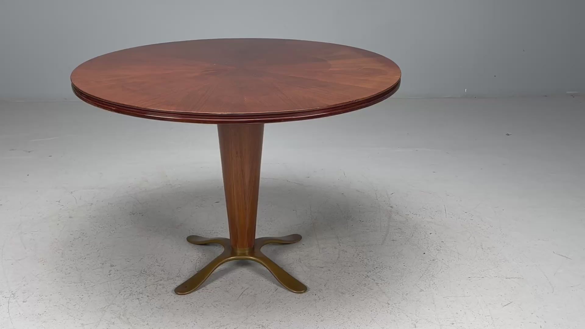 A Mahogany and bronze center table designed and produced Paolo Buffa in Italy c. 1940s. this example features a pedestal base, starburst top, and cast bronze base. Table top presents with scratches and wear consistent with age and use.