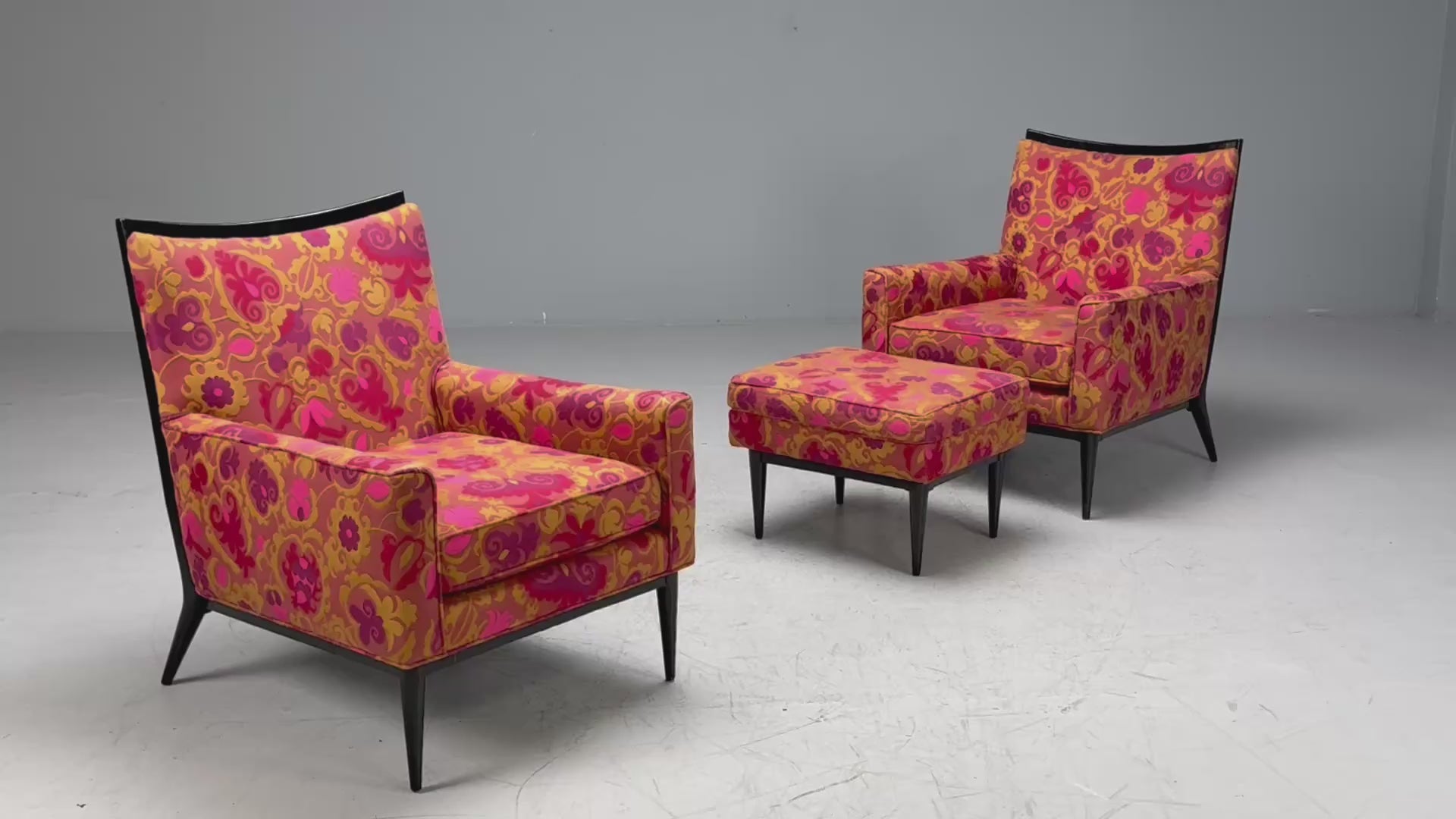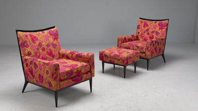 A pair of model 1322 lounge chairs designed by Paul MCobb for Directional Furniture in the United States in the middle of the 20th century. Each example features an ebonized wood frame and a bright and cheery patterned fabric. Matching ebonized wood and fabric ottoman available separately.