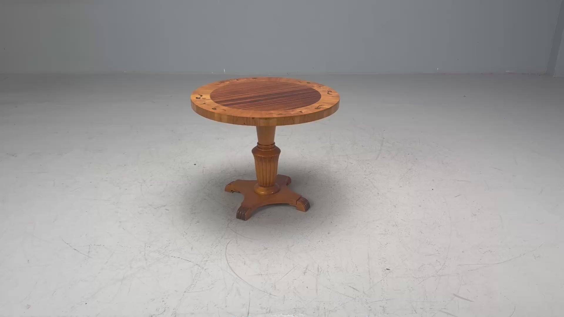 A Biedermeier style center table designed and produced in Sweden c. 1930s. Featuring a wonderful inlay top, pedestal base, and four reeded feet.