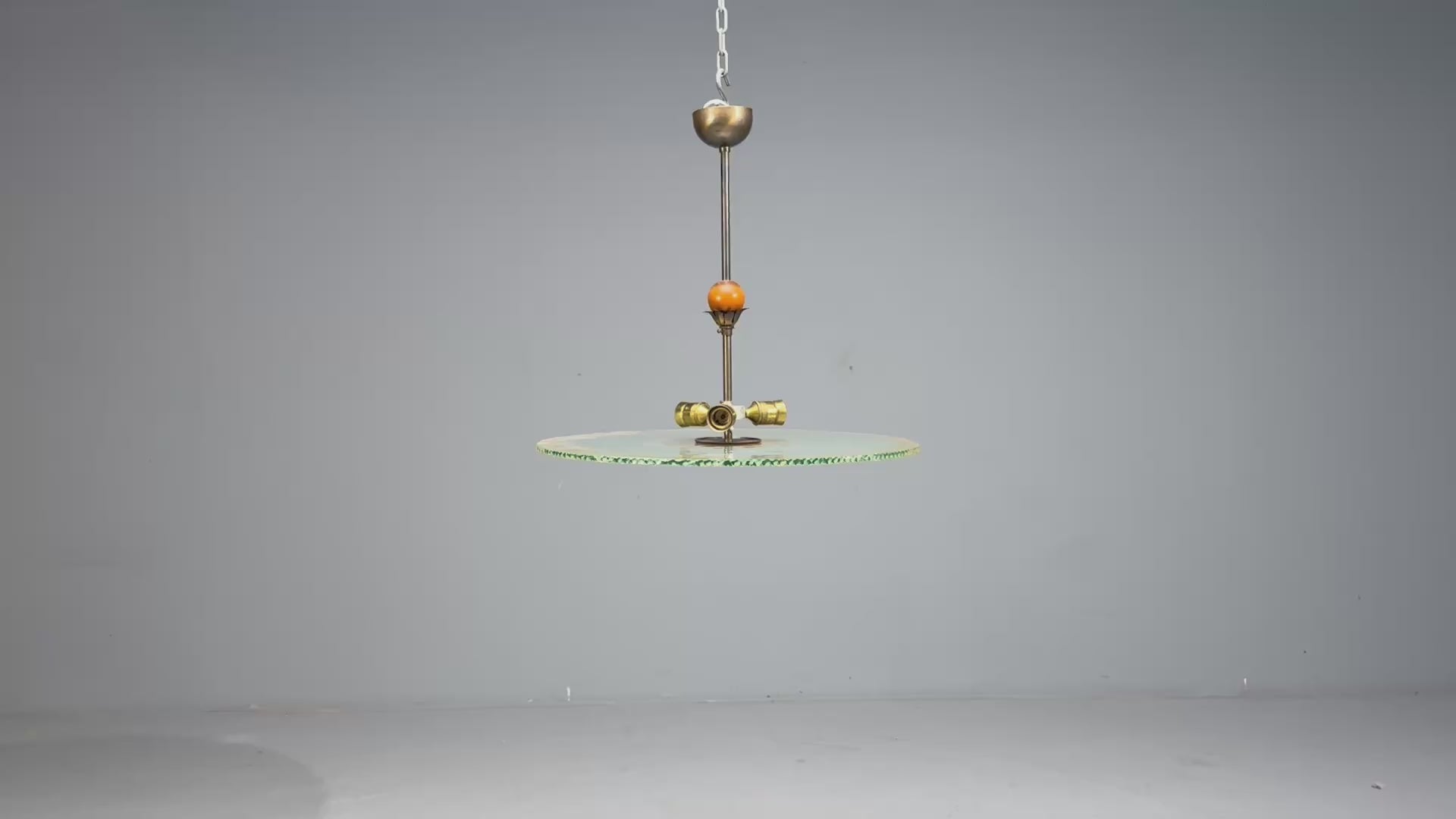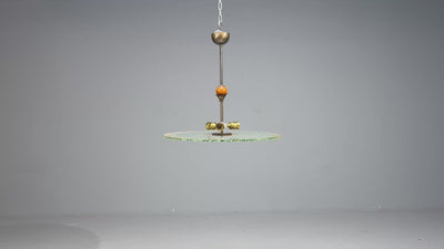 A raw glass, brass and wood pendant light designed and produced in Sweden in the early half of the 20th century.
