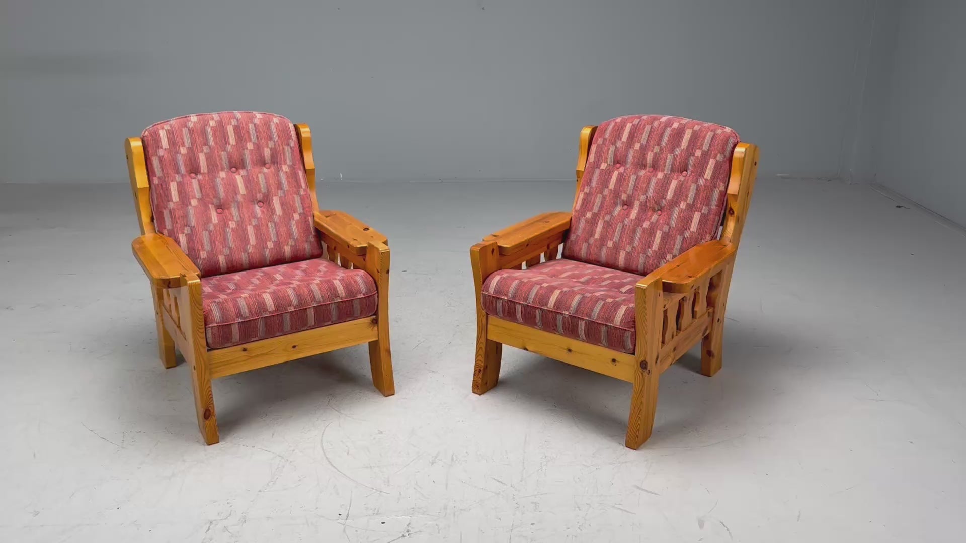Swedish Modern, Pine, Red Fabric, Brutalist Lounge Chairs, Sweden, 1950s
