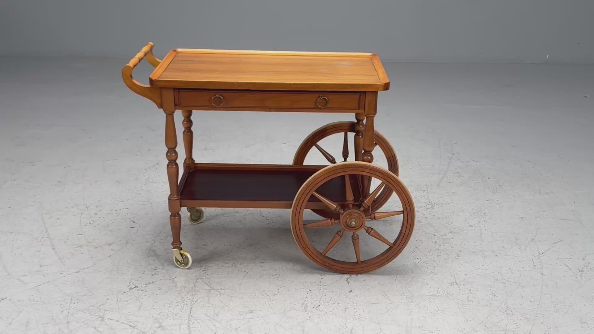 A large wood and brass rolling trolley designed and produced in Sweden in the later half of the 20th century.