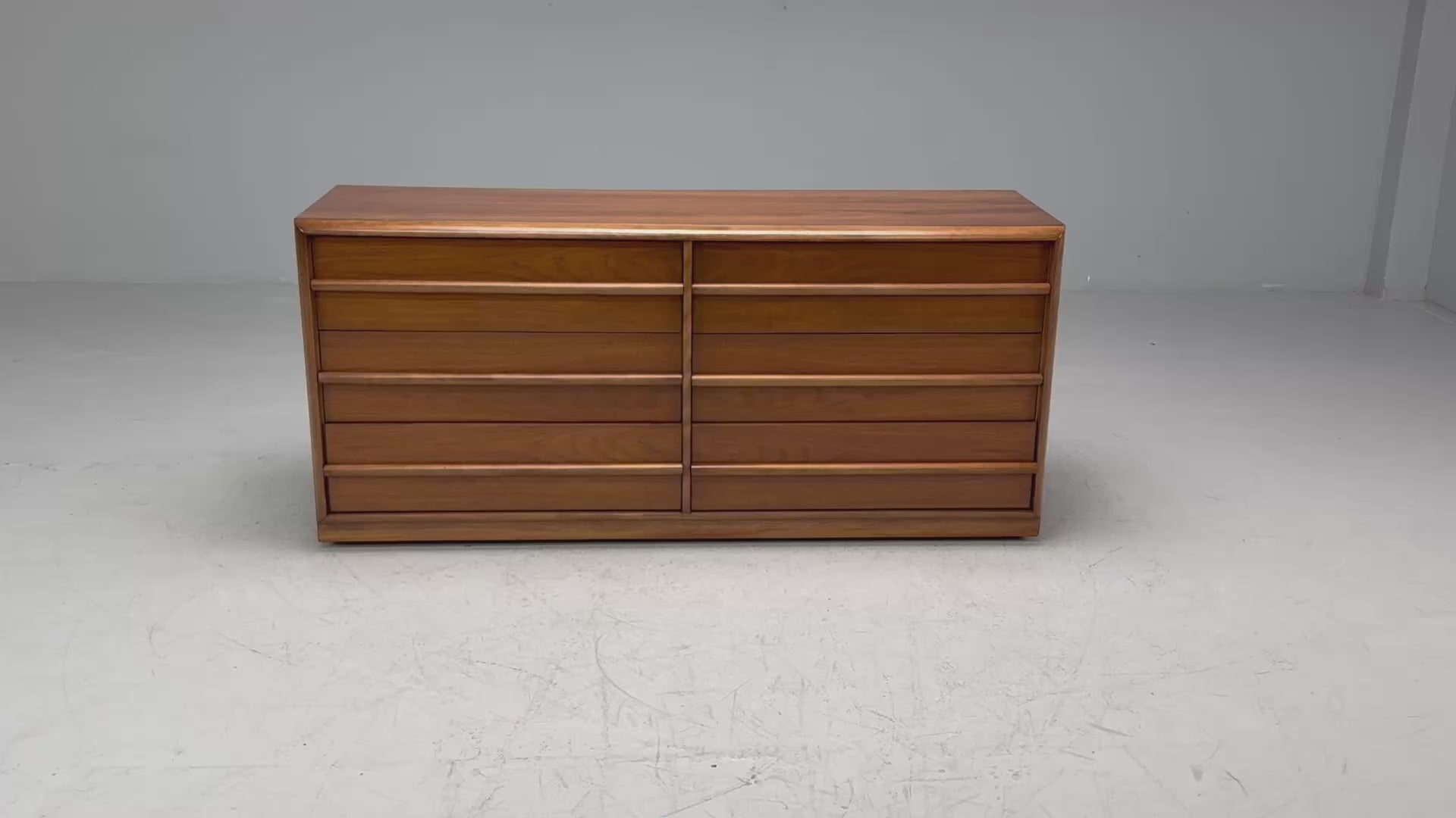 A fully refinished double dresser designed by T.H. Robsjohn-Gibbings for Widdicomb in the US c. 1960s. This example features six pull out drawers having rounded edges and hidden pulls to establish a soft and minimal look. Original WIDDICOMB manufacturer label present on the interior of one drawer.