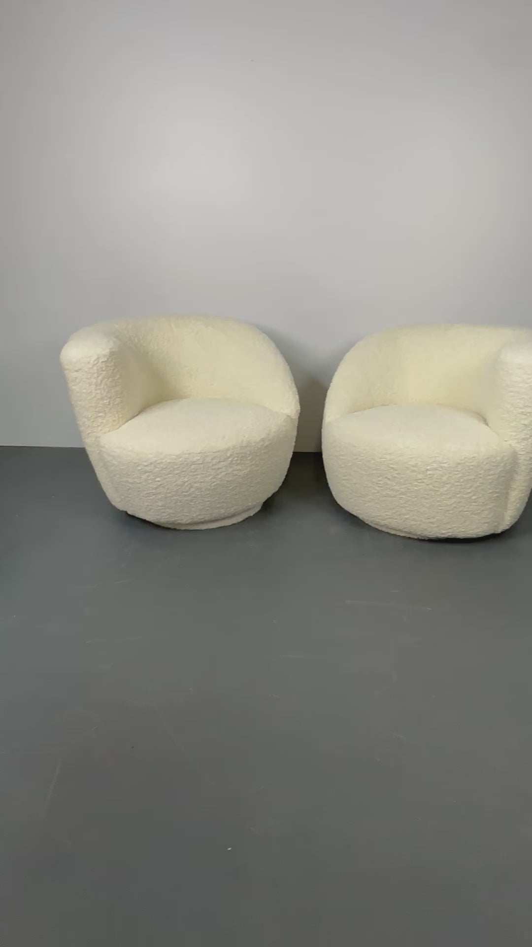 Mid-Century Modern, White Boucle, Nautilus Style Kidney Shape Swivel Chairs, USA, 1970s